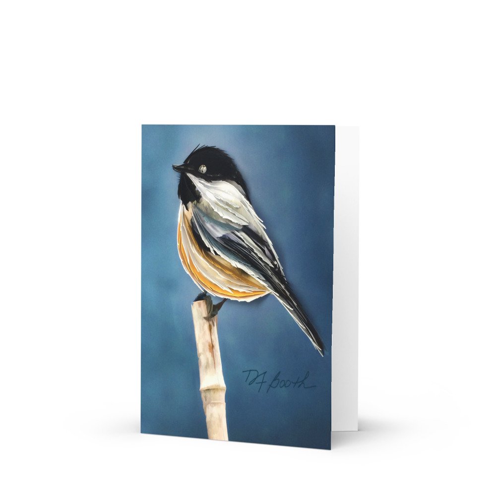 Shop › Black Capped Chickadee – Greeting Card Image 1 of 1 Black Capped Chickadee – Greeting Card $5.00 Sold Out Quilled paper artwork by Different Light Studio. Black Capped Chickadee. Sold Out Added! Quilled paper artwork by Different Light Studio. Black Capped Chickadee.